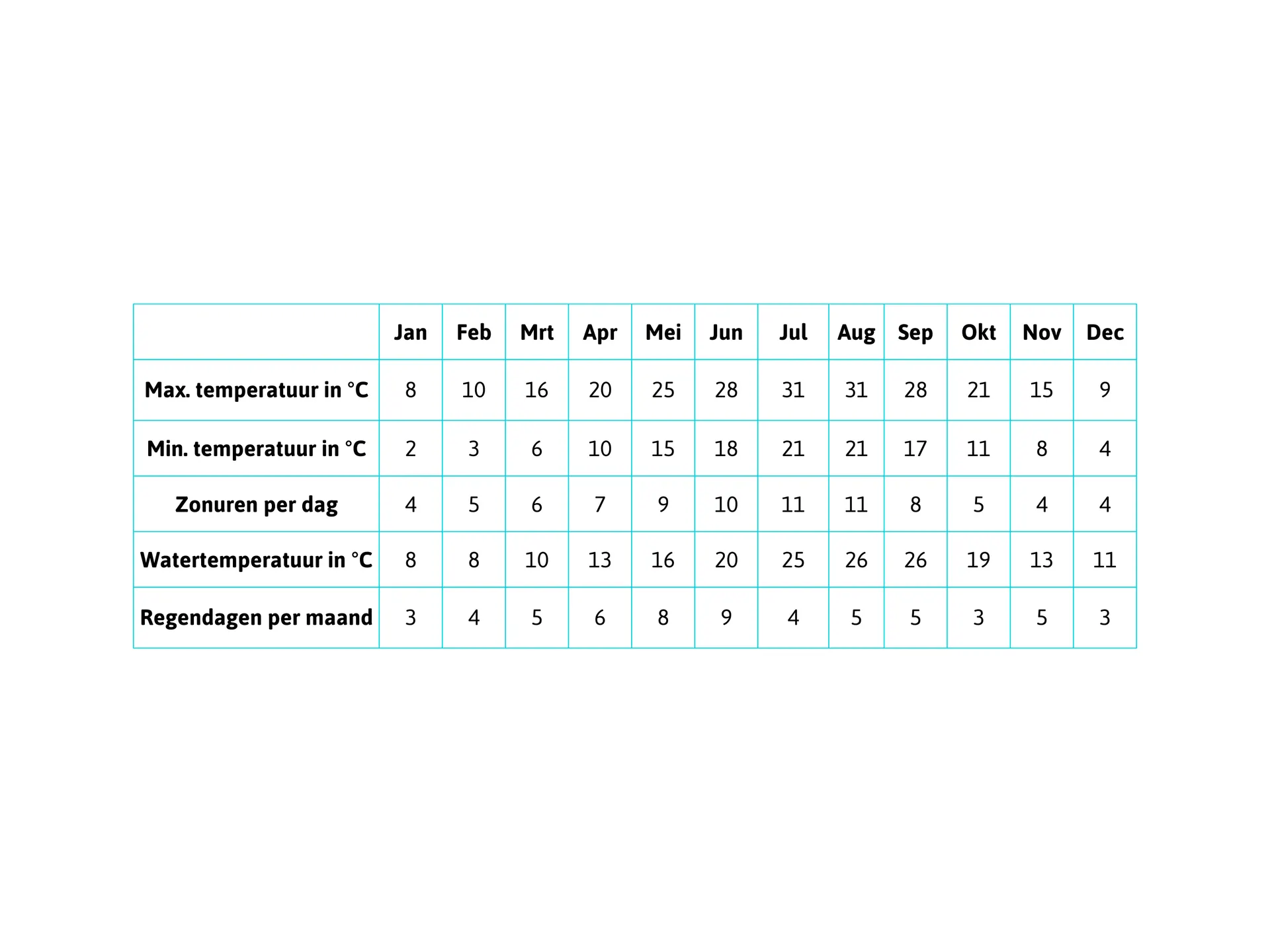 Juli: 31°C, 11h zon, 25°C watertemp., 4 regendagen